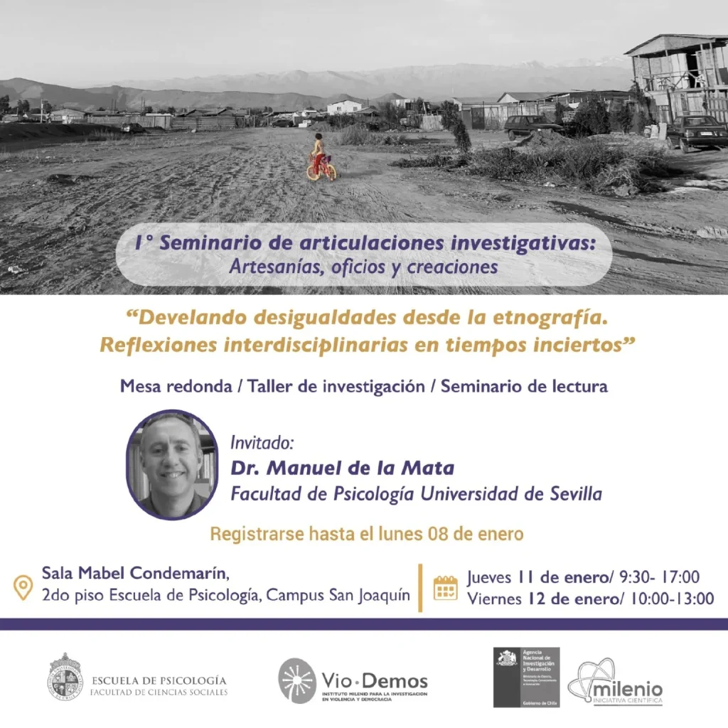 El 1° Seminario de articulaciones investigativas: Artesanías, oficios y creaciones. “Develando desigualdades desde la etnografía. Reflexiones interdisciplinarias en tiempos inciertos” es una iniciativa de las profesoras de la Escuela de Psicología UC e investigadoras del Instituto Milenio VioDemos, Marcela Cornejo y Manuela Badilla, y de Sofía Bowen, de la Escuela de Antropología de la UC. La instancia cuenta con el apoyo de la Vicerrectoría de Investigación de la Pontificia Universidad Católica de Chile.